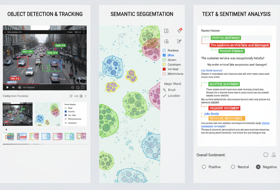 Accelerate your computer vision projects with high-precision image and video annotations. Leverage advanced vision taxonomies, pixel-level segmentation, temporal labelling, and multi-layer quality checks to improve model accuracy, strengthen perception systems, and speed up training for detection, tracking, OCR, and action analysis.